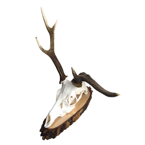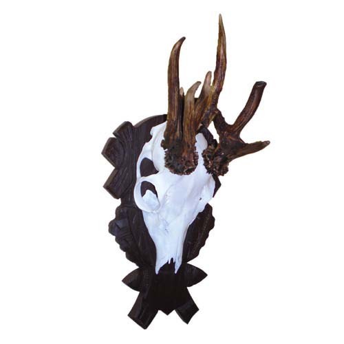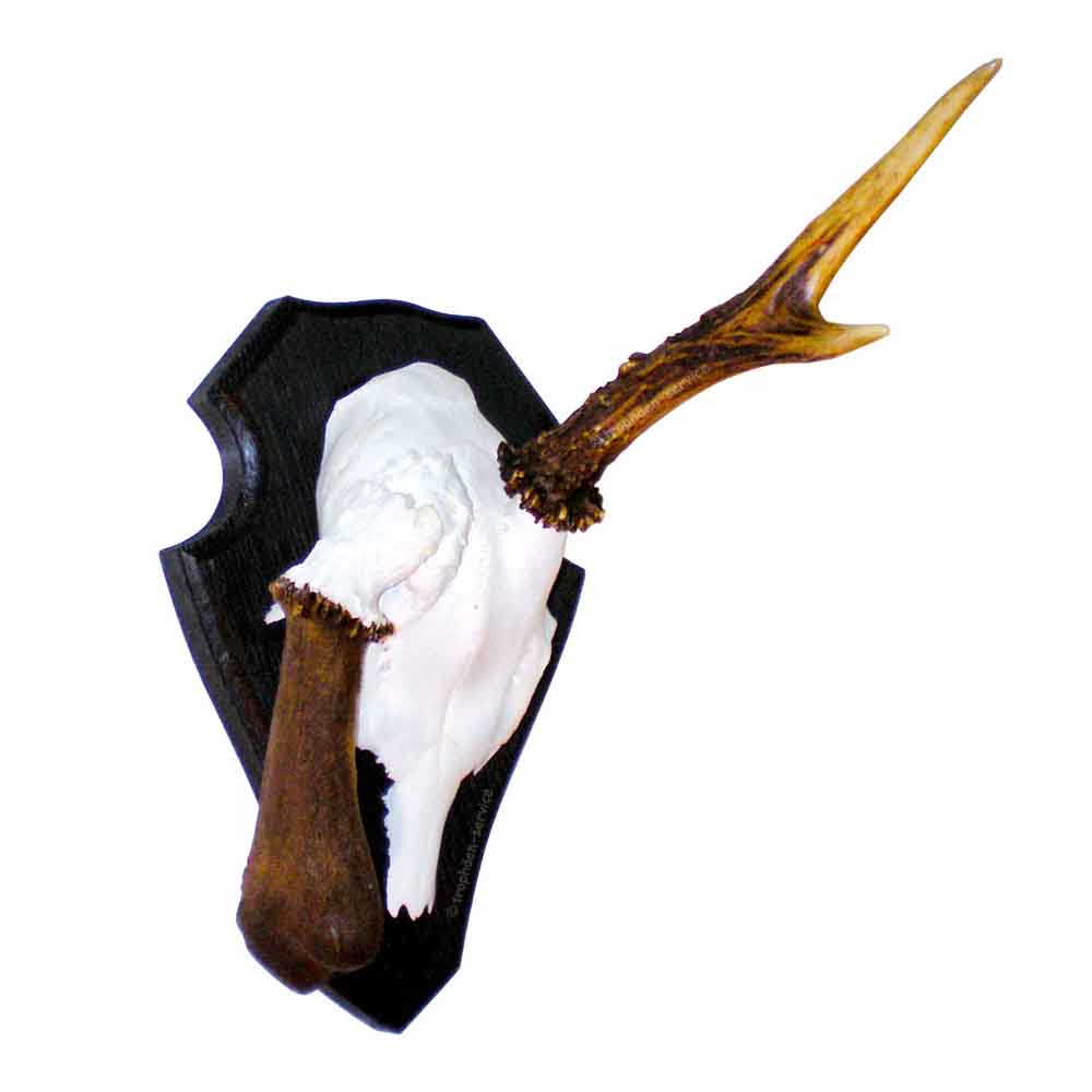 Einen ungeraden 10er Rehbock sehen auch wir nicht alle Tage. Aufgesetzt auf ein geschnitztes Trophäenschild, hebt es diese besondere Trophäe hervor.